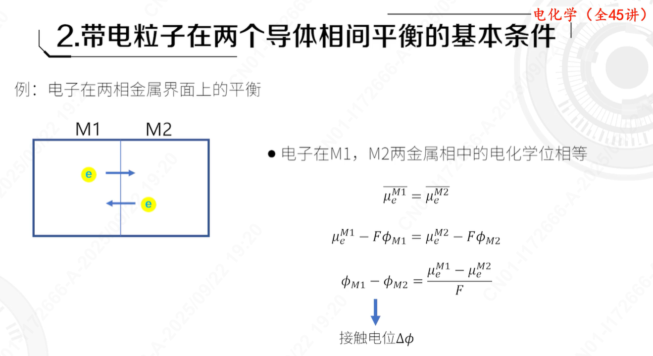 - 这个正电压会吸引电子(e⁻),使得金属电极中的电子能量(即电子的化学位 μ_e^M)降低(可以通俗理解为电子更“稳定”了,更不愿意离开电极)。