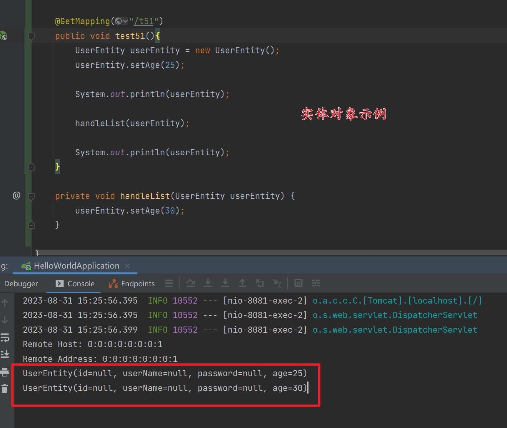handleList方法调用后:[UserEntity(id=null, userName=null, password=null, age=30), UserEntity(id=null, userName=null, password=null, age=30), UserEntity(id=null, userName=null, password=null, age=30)]