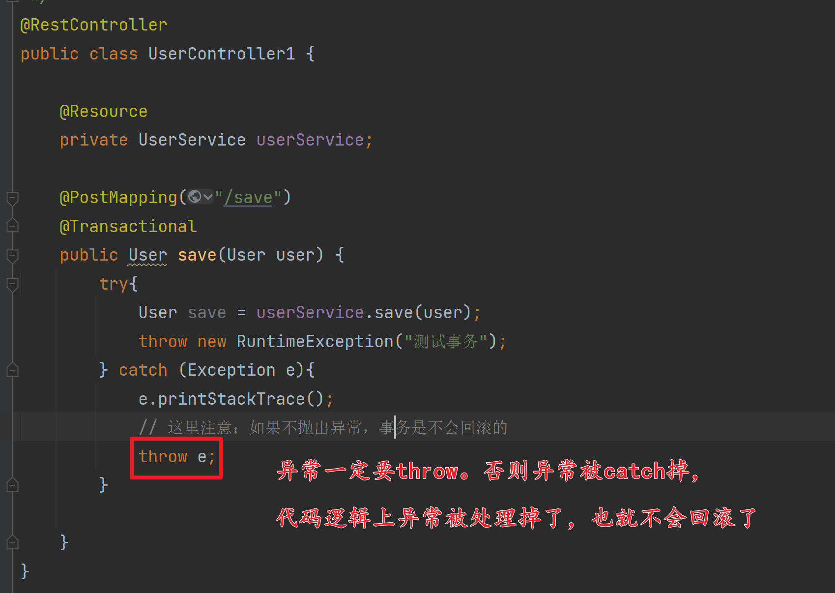// 这里注意:如果不抛出异常,事务是不会回滚的